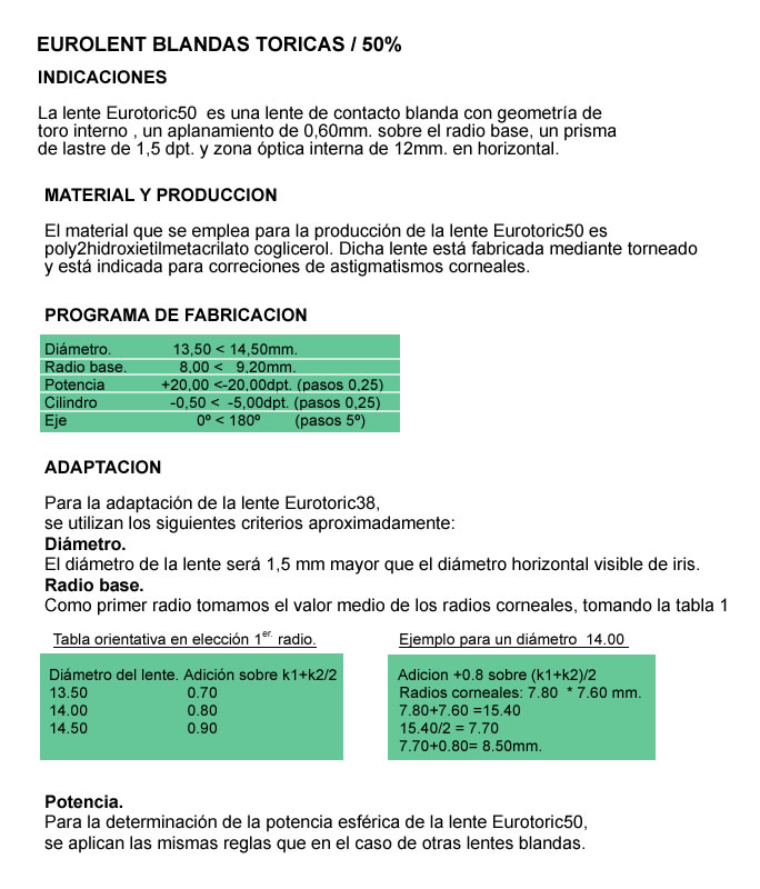 El material que se emplea para la producción de la lente Eurotoric38 es hidroxietilmetacrilato. Dicha lente está fabricada mediante torneado y está indicada para correciones de astigmatismos corneales.