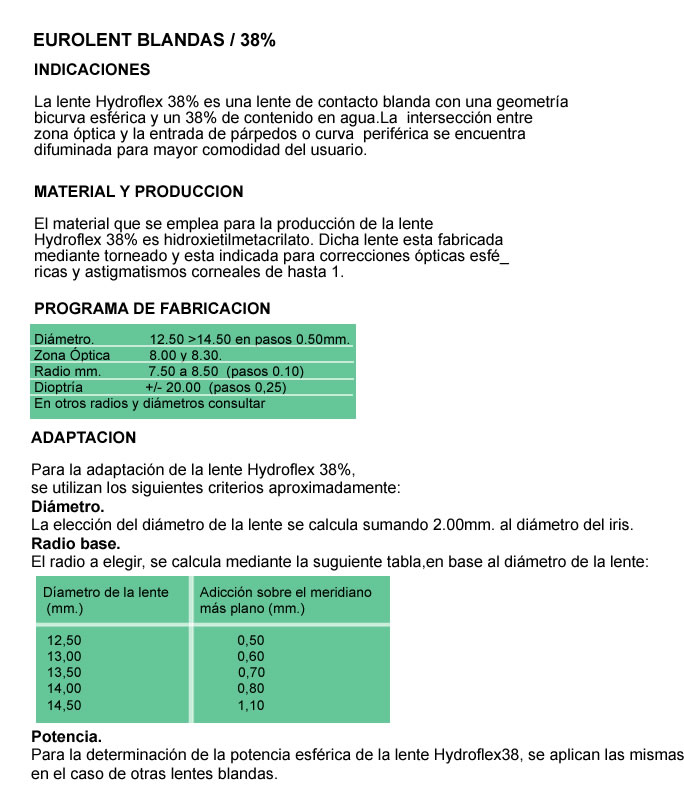 El material que se emplea para la producción de la lente Hydroflex 38% es hidroxietilmetacrilato. Dicha lente está fabricada mediante torneado y estáindicada para correcciones ópticas esféricas y astigmatismos corneales de hasta 1.