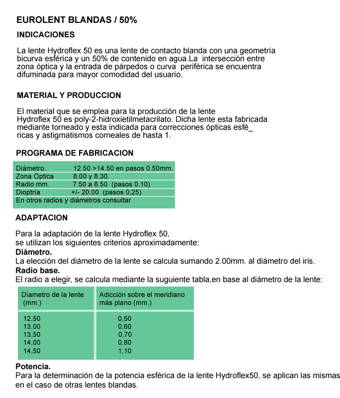 El material que se emplea para la producción de la lente Eurotoric50 es poly2hidroxietilmetacrilato coglicerol. Dicha lente está fabricada mediante torneado y está indicada para correcciones de astigmatismos corneales.