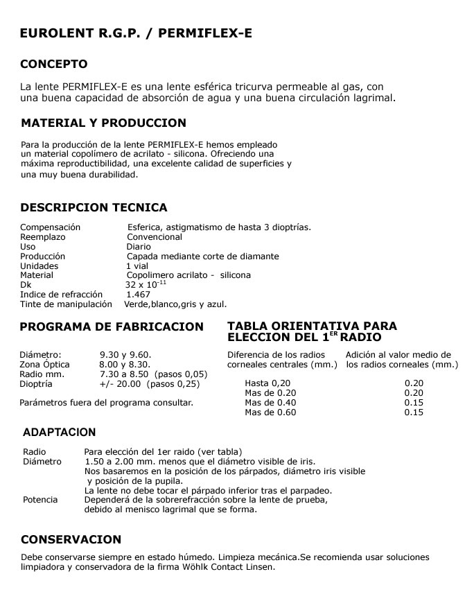 La lente PERMIFLEX-E es una lente esférica tricurva permeable al gas, con una buena capacidad de absorción de agua y una buena circulación lagrimal.
